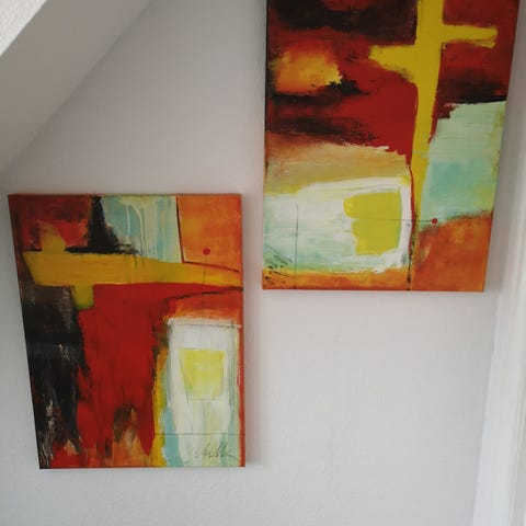 Abstrakt maleri sæt med ramme. Sættet består af flere billeder i forskellige rektangulære formater, alle med abstrakte motiver i lyse og mørke nuancer, herunder brun, hvid, sort, rød og enkelte blå toner. Malerierne er indrammet i en mørk, glat ramme med metal- eller metal-look kant. Et af hjørnerne på en ramme viser skade. Billederne egner sig til ophængning i stue, gang eller kontor og kan hænge samlet som serie eller hver for sig. Maler Alice Kramhøft