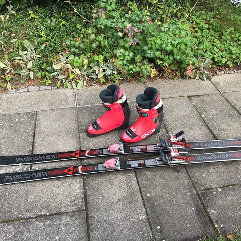 Pris 100 kr. par ski, og 100 kr. for par støvler, hjelme, stave og briller medfølger.