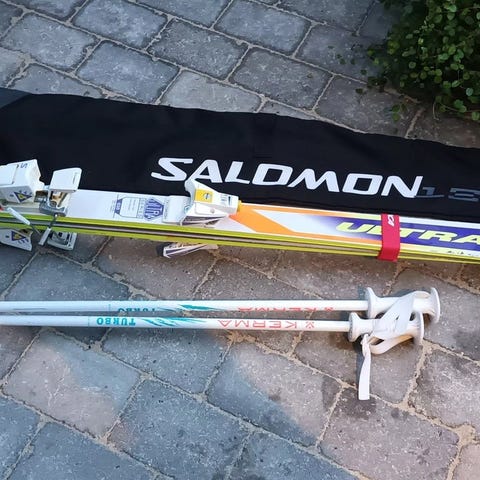 Slalomski med støvler, dame sr 38, Salomon, herre 42,5. Dalbello, plus hjelme, briller og slibeudstyr.
