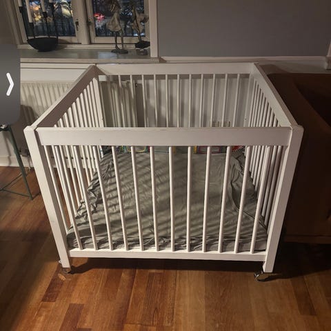 Meget fin 6 kantet kravlegård med blød sengerand der fylder bund og kant. Bunden kan løftes. Den trænger lidt maling, men er ellers i fin stand.