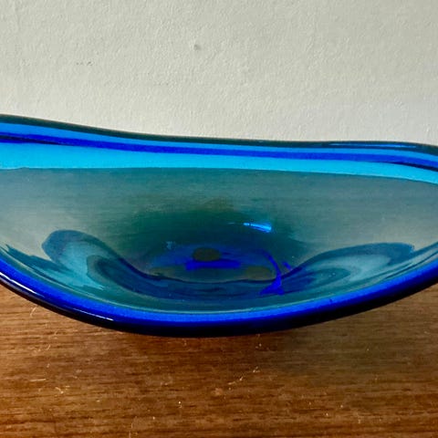 Selandia er mundblæst/håndlavet i en klar blå farve og designet af Per Lütken i 1950érne. Brug fadet som skulpturel kunstgenstand på bordet eller i reolen eller fyld den med årstidens frugt.