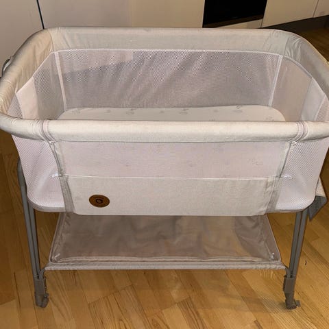 Kinderkraft bedside crib til spædbørn. Sengen er i grå tekstil med lys trædetalje på kanten og metalstel. Den har netvindue i siden for bedre udsyn og luftcirkulation samt justerbare stropper til fastgørelse ved voksenseng. Egnet som side-by-side babyseng ved forældreseng og kan også bruges som selvstændig babyseng i soveværelse eller stue. Giv et bud