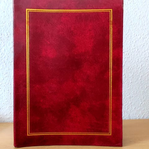 Fotoalbum i stort format med beige omslag og mørk, struktureret ryg. Albummet har kraftige sider, som egner sig til indklæbning af fotos, udklip eller andre minder. Velegnet til opbevaring og organisering af billeder fra f.eks. ferier, familiebegivenheder eller andre anledninger.