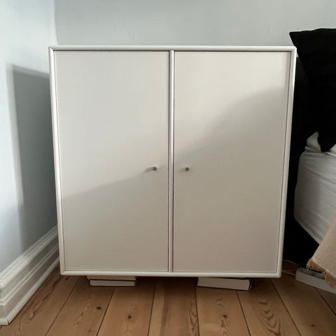 Super fint skab i farven coffee. Mål 46,8, 69,6, 38. Der er sat hjul under. Sælges evt uden disse. Der er små ridser, hvor lågen lukker let mod inderside - se foto. Ikke noget man ser, når skabet er lukket