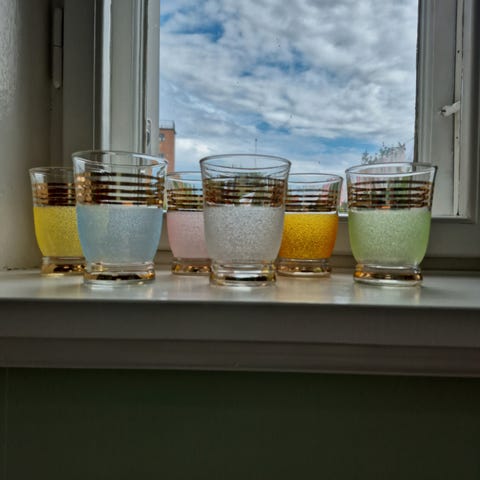 Gamle sodavandsglas, på brun fod fra ca. 1940. Alle 8 glas perfekte uden skår eller revner. Glasset er hel klart.