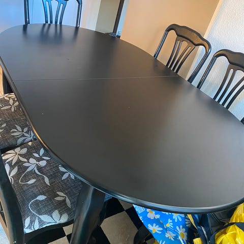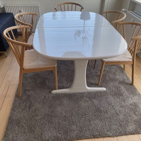 Det måler 210x90 når pladen er sat i. Uden plade måler det 170x90. Pladen er integreret i bordet, og der er et hulrum, så man eks. kan lægge bestik i. Stolene medfølger ikke. Mærket er “Istikbal”.