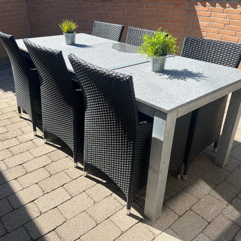 Havebord galvaniseret ramme med fire granit plader.Bordet er tung.Der er plads til 8 ved bordet Mål 140 x 140 x 75. Står som ny og har altid stået på overdækket terrasse.Ny pris var 5000 kr