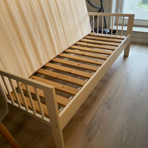 IKEA juniorseng i træ med tremmer i siderne. Sengen er malet i blå og er egnet til børn, der er vokset ud af tremmeseng, men endnu ikke skal over i en almindelig enkeltseng. Velegnet til brug på børneværelset som fast seng eller ekstra seng. Madrassen på billederne viser sengens størrelse, men mål bør kontrolleres ved interesse, måler 166x 75 cm