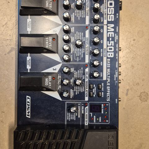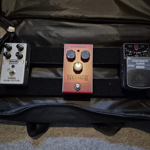 Pedalbord med forskellige effektpedaler, i blød, sort bæretaske med håndtag og skulderrem, som gør det nemt at transportere udstyret til øvning eller koncert. På billederne ses også de originale kasser til pedalerne. Alle pedaler er blevet yderst velholdt.