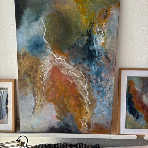 Abstrakt maleri udført i akryl på lærred i stærke, flerfarvede nuancer som rød, orange, gul, blå og pink. Maleriet har en kraftig, struktureret overflade med tykke lag maling. Det er monteret i en smal ramme og fremstår som et større vægmaleri egnet til ophæng i fx stue, køkken-alrum eller kontor.