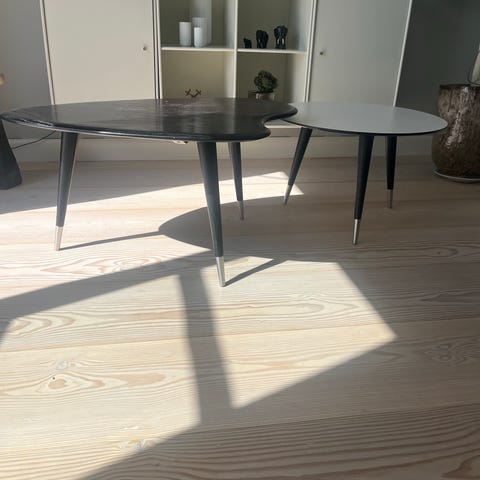 Flot sofabord med en massiv bordplade med indfræsede ben i rustfrit stål. Model: AK 940-942, 100 x 100 x 45 cm i sæbebehandlet eg. Nypris: Ca. 9.000,-