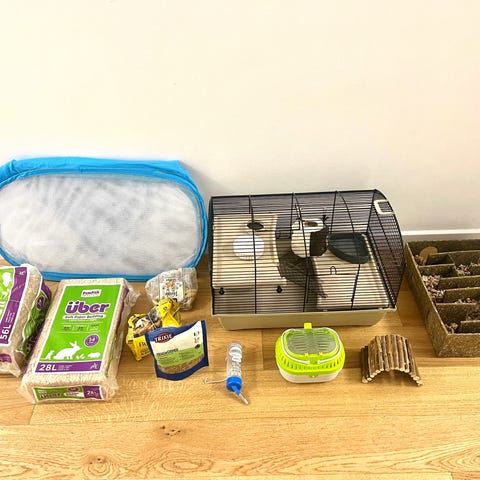 Bur til hamster med tilbehør udstyr og hamsterfoder osv.