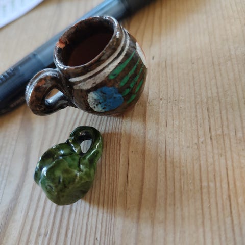 Keramik æske med låg i rund form. Æsken er glaseret i en lys, hvidlig tone med håndmalet blomstermotiv i brune, blå og grønne nuancer på låget. Indersiden er glatglaseret, mens bunden viser den rå lerfarve med et enkelt mærke eller signatur. Velegnet som lille opbevaringsæske til smykker eller andre små genstande.