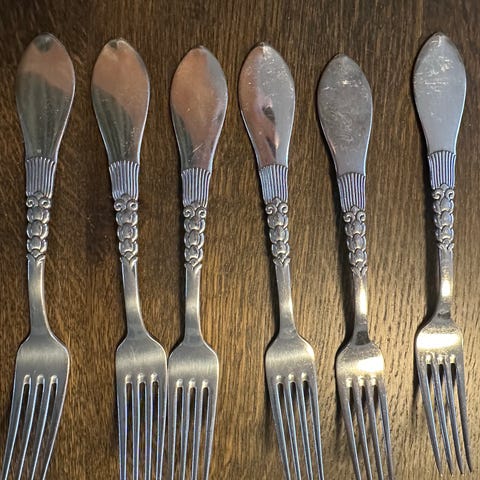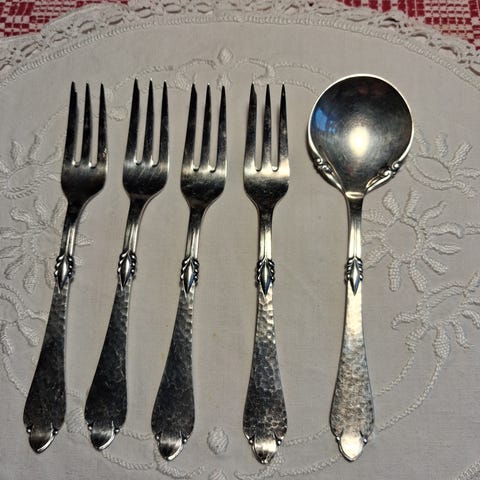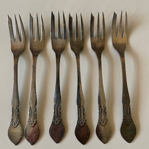Seks flotte vintage kage gafler fra Danske COHR i Riberhus design materiale sølvplet