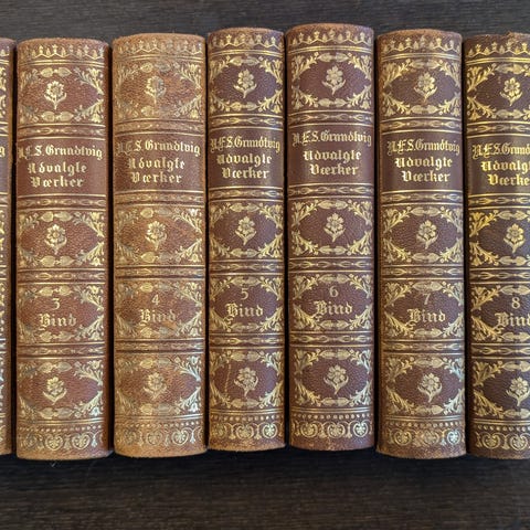 Halvlæderindbinding med marmorerede sider. Velegnet som historisk referenceværk om Danmarks historie samt som samlet bogsæt til reolopstilling.