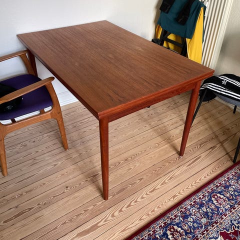Jeg skulle vælge en designer og da jeg ikke ved hvem der har lavet bordet valgte jeg bare en tilfældig. Bordet er altså et dejligt retro teakbord med udtræksplade i midten. Der er brugsspor og man kunne med fordel give det en slibning.