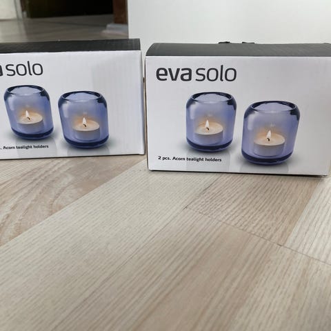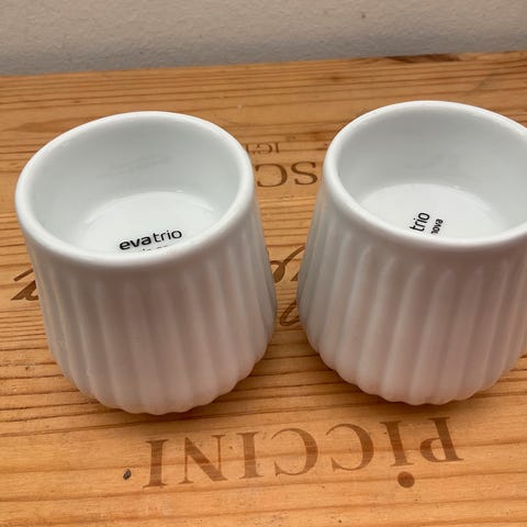 Eva Trio fyrfadsstager i hvidt porcelæn med riflede sider. Sættet består af to ens stager, der er formet som små cylindriske kopper med let udadgående form. Velegnet til almindelige fyrfadslys og kan bruges som enkel borddekoration eller stemningslys i hjemmet,sælges da jeg aldrig bruger dem,kun stået i et skab,ingen skår,revner eller brugsmærker,højde:6,5cm.