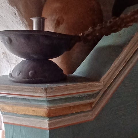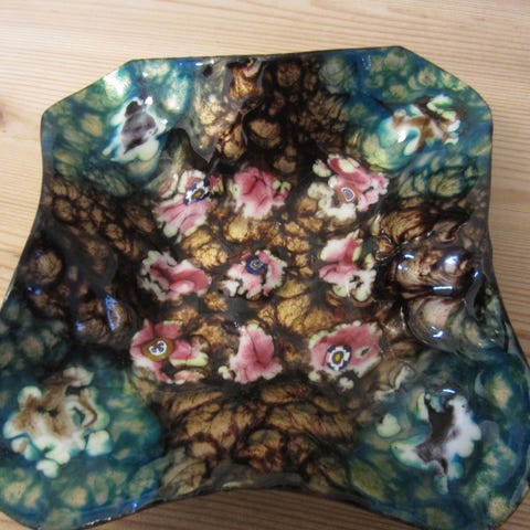 Dekorativ hængeskål i kobber ophængt i stativ af sort smedejern. Skålen er rund og fastgjort med kæder til et tredelt stativ med buede ben. Velegnet som indendørs dekoration, f.eks. til fyrfadslys, små planter eller opbevaring af små genstande. Ingen synlig mærkning på produktet.
