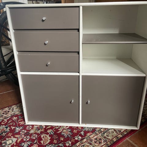 Reolen fremstår i pæn og velholdt stand med almindelige brugsspor. Lågerne fungerer som de skal, og hængslerne er intakte. Tidløst design i høj kvalitet fra Montana – kan nemt kombineres med andre Montana-moduler.