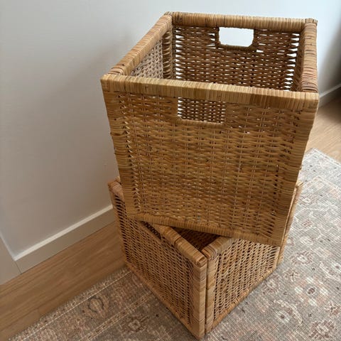 legetøjskurve sæt i flettet naturmateriale. Sættet består af flere små kurve i forskellige former og størrelser, blandt andet en lille vugge på træfod samt runde og hjerteformede kurve. Kurvene er velegnede som tilbehør til rolleleg, fx til dukker eller butikleg, eller til opbevaring af småting på børneværelset. Farven er natur og materialet er flettet bast/rotting-lignende til dukkehus materiale.