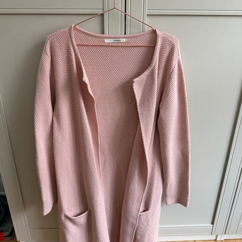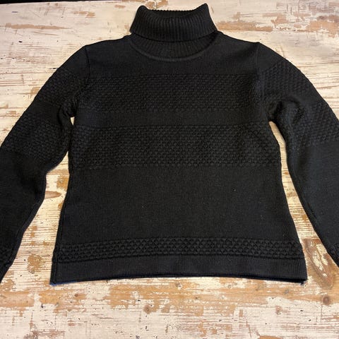 Med rullekrave. Det er str. Small, men den er meget stor i størrelsen. Skulderbrede: 65 cm. Og længde: 62 cm. 50% merino uld og 50% acrylic