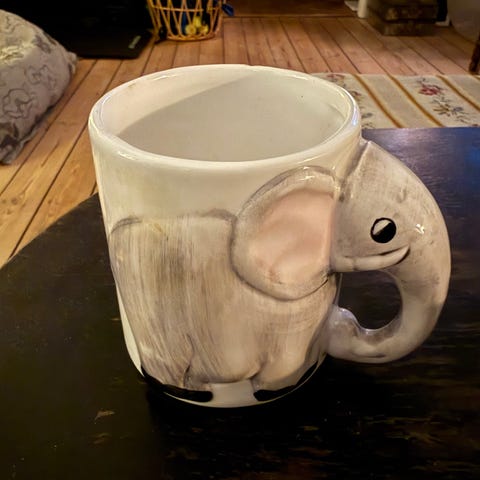 Mørkegråt elefantkrus i porcelæn med elefanthoved og snabel som hank.
