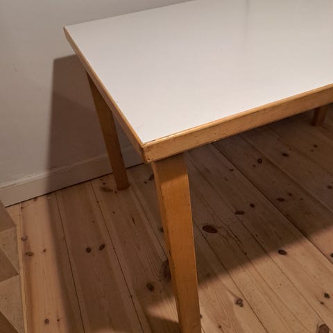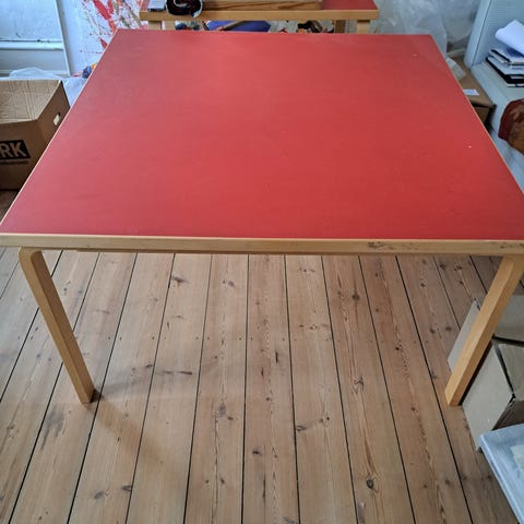 Dejligt, mindre Aaltobord i den sjældne røde farve linoleum. Kan bruges som forlængerbord eller mindre skrivebord – også til et barn. Fra kunstnerhjem. Formbøjet bøg, gedigent finsk design. Jeg har yderliger to borde til salg. Rødt 120 x 120 og hvidt 120 x 75