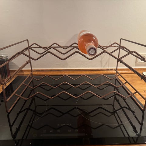 Stilfuld, fleksibel og stabil vinreol i kobber mat farve med plads til 5 flasker vin på hver række. Passer til stort set alle flasketyper, også halvflasker, med en diameter på op til 9,5 cm. Kan stå enkeltvis eller stables. Måler ca: Dybde 35 cm. Bredde 48 cm. Højde 2 samlet: 24 cm. Brugt fin stand, dog med en lille afskallingen i farven /se foto nr. 12/. Fra ikke ryge-og dyrefrit hjem.
