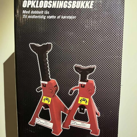 Sættet består af to blå opklodsningsbukke til understøtning af køretøjer under arbejde eller til midlertidig opklodsning af diverse tunge ting. Bukkenes højde kan justeres trinvis.