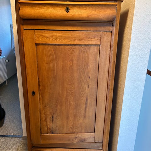 MEGET tung massiv egetræs skab med skuffer og hylder. Der skal være flere til at flytte den. 2 nøgler medfølger.