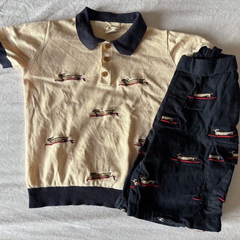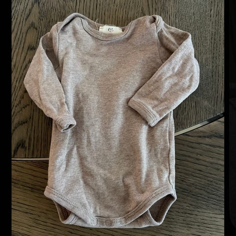Fint blødt sæt fra Copenhagen Colors. Body med krydslukning og bukser med elastik i livet, så de kan tilpasses i størrelsen. Har fået nogle pletter/misfarvninger (se billeder). 97% økologisk bomuld, 3% elastane. Kun vasket i neutral vaskemiddel.