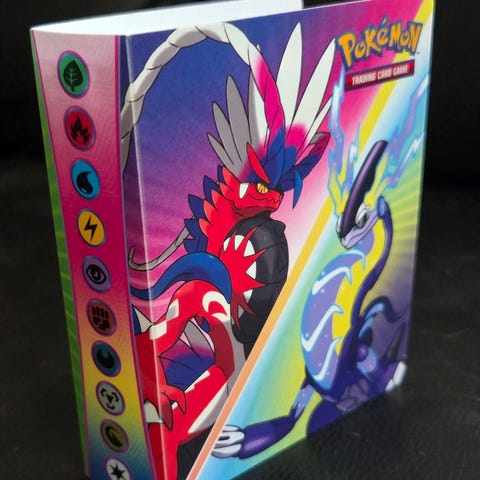 Pokémon kortmappe til opbevaring af samlekort. Mappen har motiv med Pokémon-figurer på for- og bagside samt symboler for forskellige energityper på ryggen. Medfølgende Pokémon samlekort ses på billederne, herunder et kort med lyserød/lilla baggrund. Der medfølger også en rund metalpin med figurmotiv. Velegnet til organisering og opbevaring af Pokémon kort.