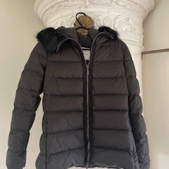 Moncler jakke i sort str. 4/M. Jakken er i let dunkvalitet, som er varm nok på en lun vinterdag. Det er en overgangsjakke både forår og efterår. Jakken er med broderet kanter, aftagelig hætte og 2 lommer foran med trykknap. Jakken er i perfekt stand bort set fra lille rifte på lommen (se sidste foto) som kun ses helt tæt på. Jakken er på ingen måde falmet. Fra ikke-ryger hjem. Sender gerne og leverer i Skive ved lejlighed.