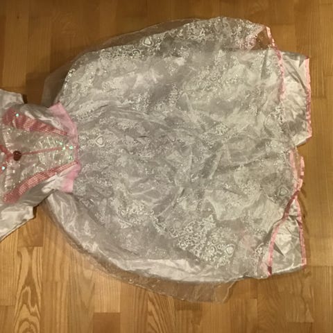 Børne prinsesse-/brudekjole i hvid med lange ærmer. Kjolen har blankt satinstof med struktur i overdelen, pyntet med stofroser og guldfarvet bånd i taljen. Skørtet er langt og fyldigt med flere lag, herunder et lag tyl for ekstra volumen. Velegnet som udklædning til fx prinsesse- eller brudekjoleleg.