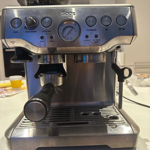 Sage espressomaskine i sølvfarvet metal Maskinen har vandtank bagtil, drypbakke og integreret udløb til kaffe. På toppen ses betjeningsknapper og display. Egnet til brygning af espresso og andre kaffedrikke i hjemmet eller på mindre kontorer. Strømkabel medfølger som vist på billederne.