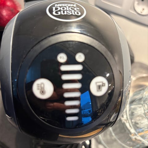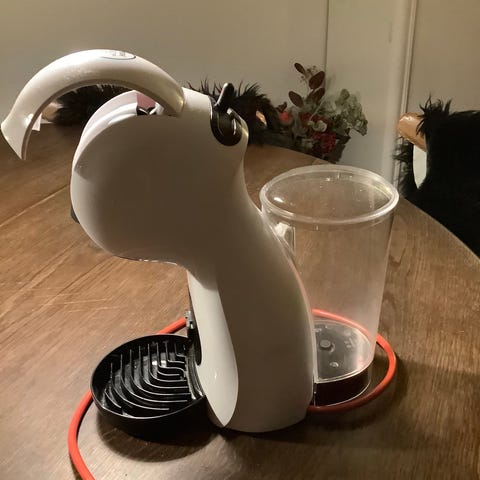 Dolce Gusto kapselmaskine i sort. Maskinen anvender Dolce Gusto kapsler til tilberedning af varme og kolde drikke. Vandbeholderen er aftagelig og gennemsigtig plast, som vist på billederne. Maskinen tilsluttes med almindelig netledning. Flere forskellige kapselvarianter kan bruges, herunder kaffe- og kakaodrikke, som eksemplerne på billederne viser.