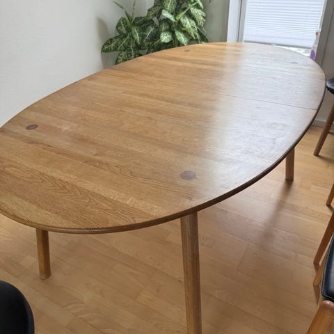 Pæn og velholdt spisebord med 2 tillægsplader på 45cm fra røg og dyrefrit hjemAfhentes på adressen.