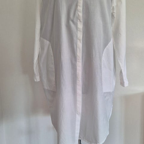 Aiayu hverdagskjole i hvid bomuld i størrelse XS. Kjolen har knaplukning foran, skjortekrave og trekvartlange ærmer med elastik ved håndleddet. Materialet er vævet bomuld med let struktur. Pasformen er løs og knælængde til midi, velegnet som hverdagskjole til kvinder.