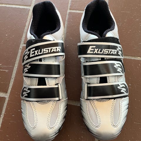 Exustar cykelsko i størrelse 42. Skoene er i sølv med sorte detaljer og lukkes med tre velcrostropper. Undersiden er udstyret med klamper til klikpedaler. Velegnet som racersko eller til anden cykling, hvor der bruges kliksystem.
