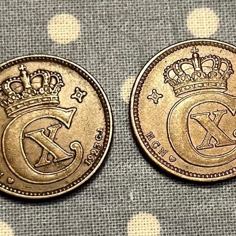 Danmark 2 øre mønter fra 1907 og 1909 i kobberlegering. Forsiden viser værdien 2 øre med teksten "Kongeriget Danmark" og årstal nederst. Bagsiden har monogram med krone. Egner sig til samling af danske mønter eller som historisk objekt fra begyndelsen af 1900-tallet.