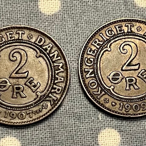 Danmark 2 øre mønter i kobberfarvet metal. Forsiden viser kronet monogram, bagsiden værdien 2 øre med dekoration. Egnet til samling, dekoration eller som supplement til møntsamling af danske småmønter.