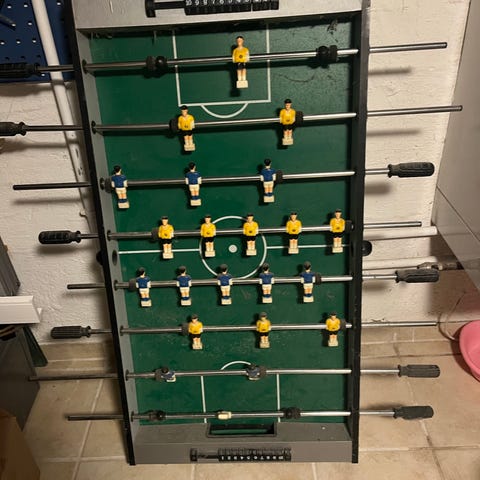 Flotte spillere og et spil med håndtag som givet en god føling. De enkelte stænger er lette at dreje og er ikke tunge. Her kan både voksne og børn spille, og alle stænger er lette at betjene. Man kan også drible bolden mellem de enkelte spillere og det er let at lægge bolden videre fra fx forsvaret til midtbanen. Original indpakning dvs kæmpe papcover medfølger hvis det ønskes, så det også kan gives som indpakket gave. Flot bordfodbold spil der sælges for kun