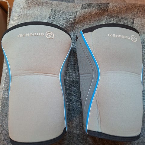 Blåt 7 mm Rehband knæbind, beregnet til støtte og stabilisering af knæet, sælges.