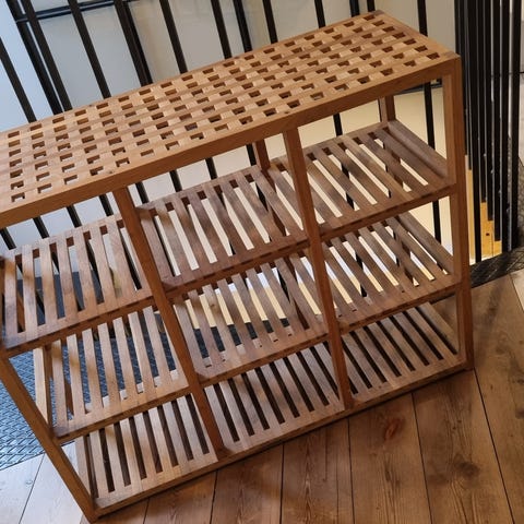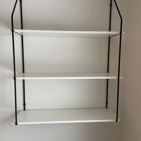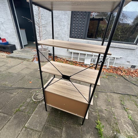 Høj smal reol med mange hylder samt lille computer bord til salg
