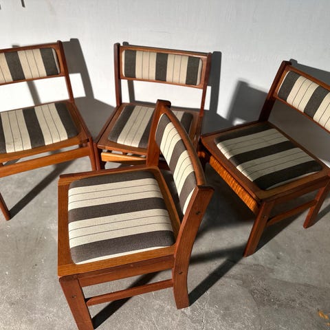 Et sjældent sæt af seks spisestuestole i teaktræ designet af Henning Sørensen i 1968. Stolene minder meget i udtrykket om Arne vodder / Henning kjaernulf.