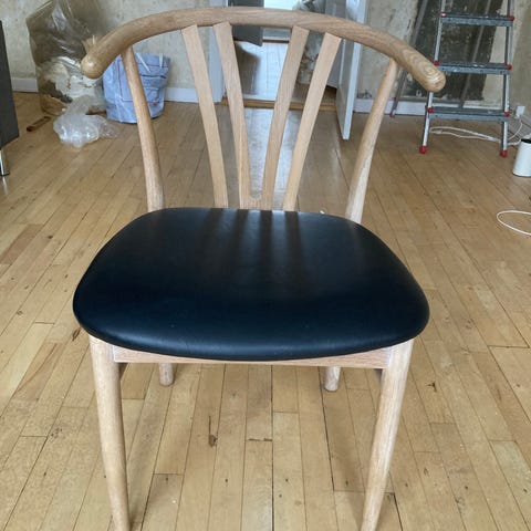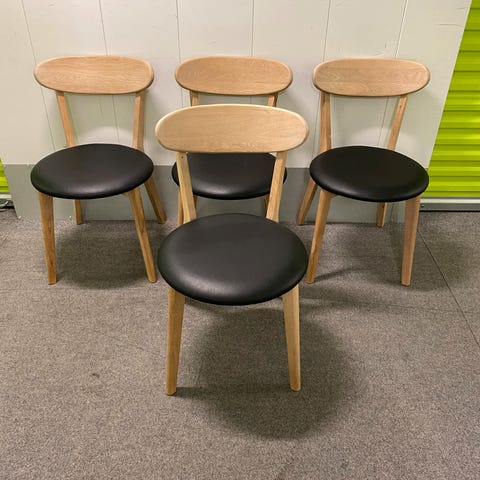 6 meget fine spisebordsstole i eg og med læderbetrukne sæder. I meget fin stand, sælges pga flytning.