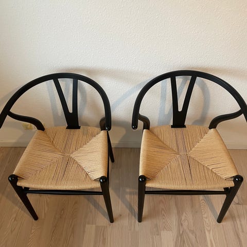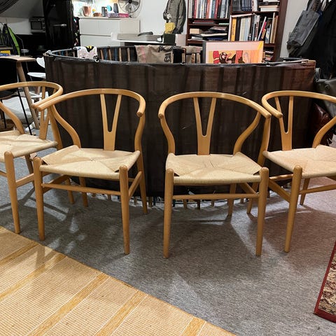 In Between stole fra &Tradition, designet af Sami Kallo model sk1 - 3 i lidt varmere nuance af grå/beige og en i koldere grå / blå eg. Stolene fremstår flotte med aldersrelaterede brugsspor - og med synlige konturerer af årene. Den ene stole har et kosmetisk slag på sædet og sælges for 750.