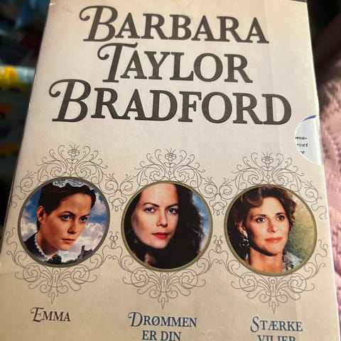 Barbara Taylor Bradford Emma dvd samleboks med tv-serierne/filmene "Emma", "Drømmen er din" og "Stærke viljer". Boksen indeholder flere dvd-diske med filmatiseringer baseret på Barbara Taylor Bradfords romaner. Velegnet til afspilning på standard dvd-afspillere, der understøtter den viste regionkode på omslaget.