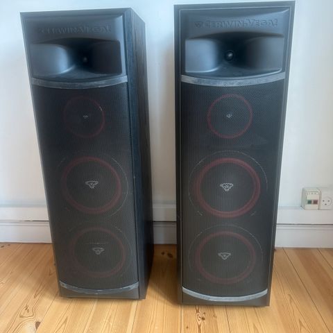 Stor sort\grå højtaller fra cerwin-vega dom virker perfekt som vil pas godt til dit setup.