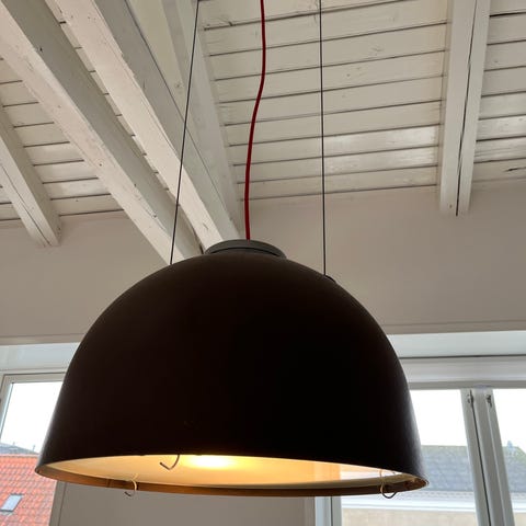 Loftlamper pendel i brun metal. Lampeskærmene er halvkugleformede med plads til tre pærer i hver. Indersiden er guld for bedre lysrefleksion. Leveres med ledninger til ophæng i loft. Egnede til belysning over spisebord, køkkenbord eller i opholdsrum.